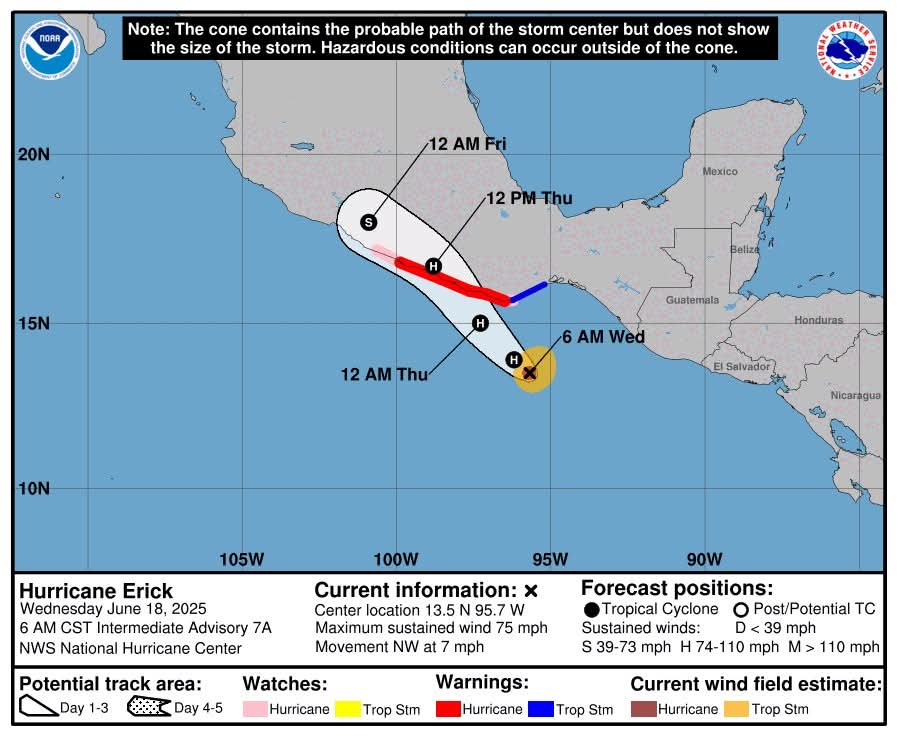 Según la trayectoria pronosticada, se espera que el centro de Erick se acerque a la costa sur de México, en los estados de Oaxaca y Guerrero, en la última hora de esta noche.