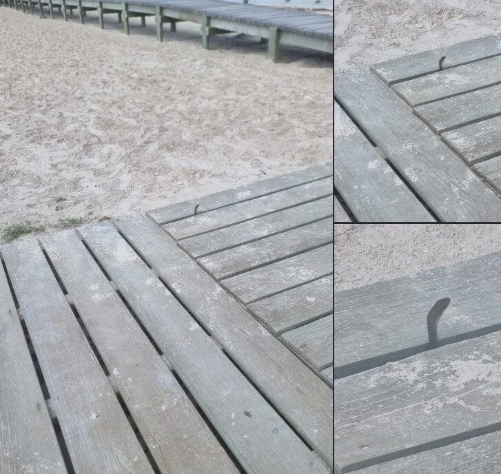 En la imagen se puede observar cómo la serpiente de la especie (Senticolis triaspis) culebra oliva, también conocida como culebra ratonera para los locales, se asoma entre los espacios del tablado del ya citado sitio.