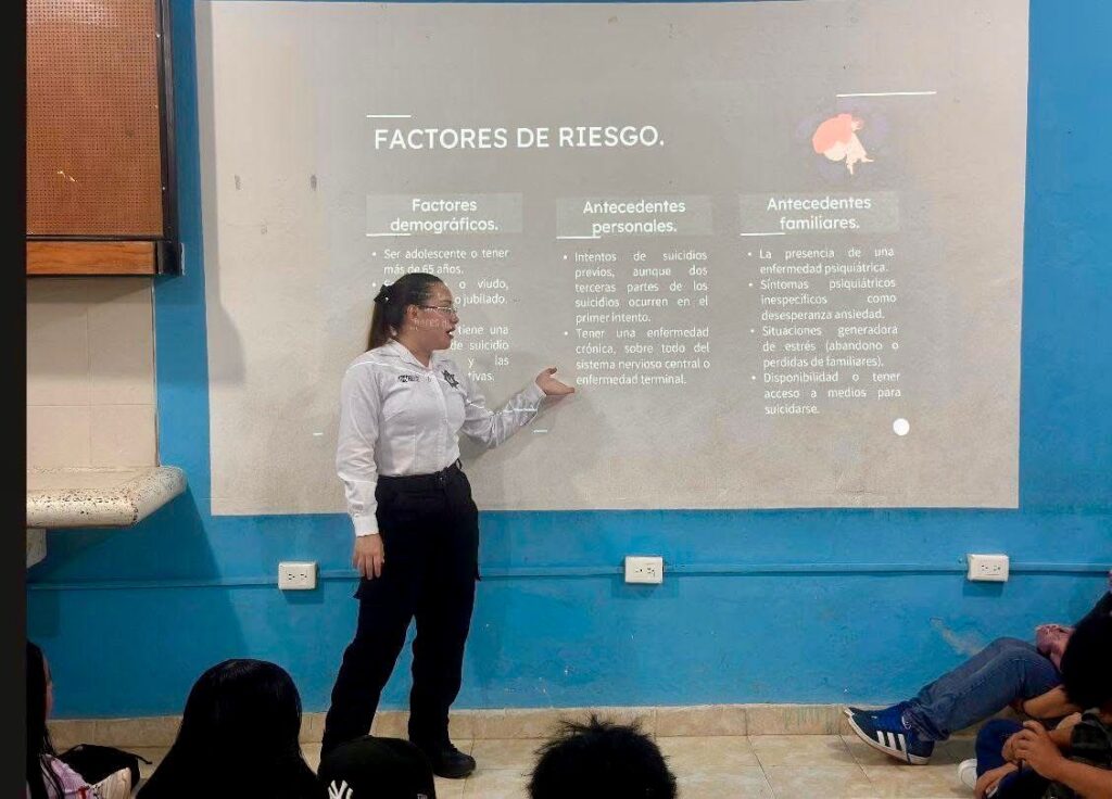 Estrategia preventiva juvenil: El Departamento de Prevención al Delito de la Policía Municipal de Kanasín refuerza su compromiso con la salud mental de los jóvenes, ofreciendo información vital para identificar y afrontar los factores de riesgo de la conducta suicida